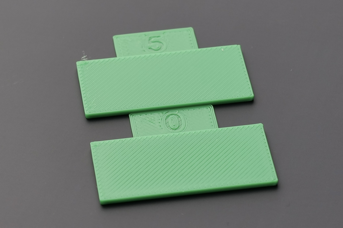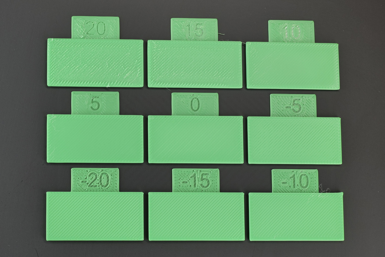 Judging the print result below, choosing one of the top three samples is not recommended, because the flow rate is too high, making the printed lines overlap. The bottom three samples are under-extruded, and there are gaps between the lines. Since -5 is clearly under-extruded, we are left with the middle options, 5 and 0.