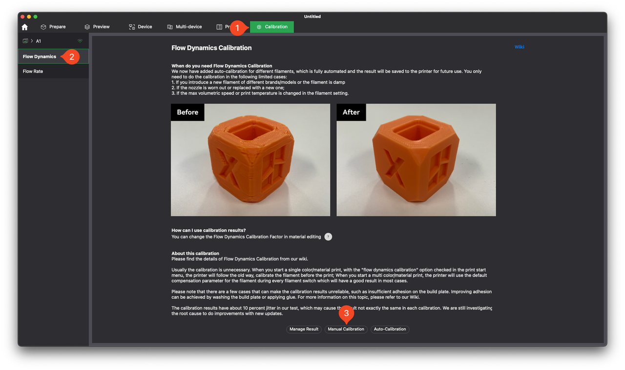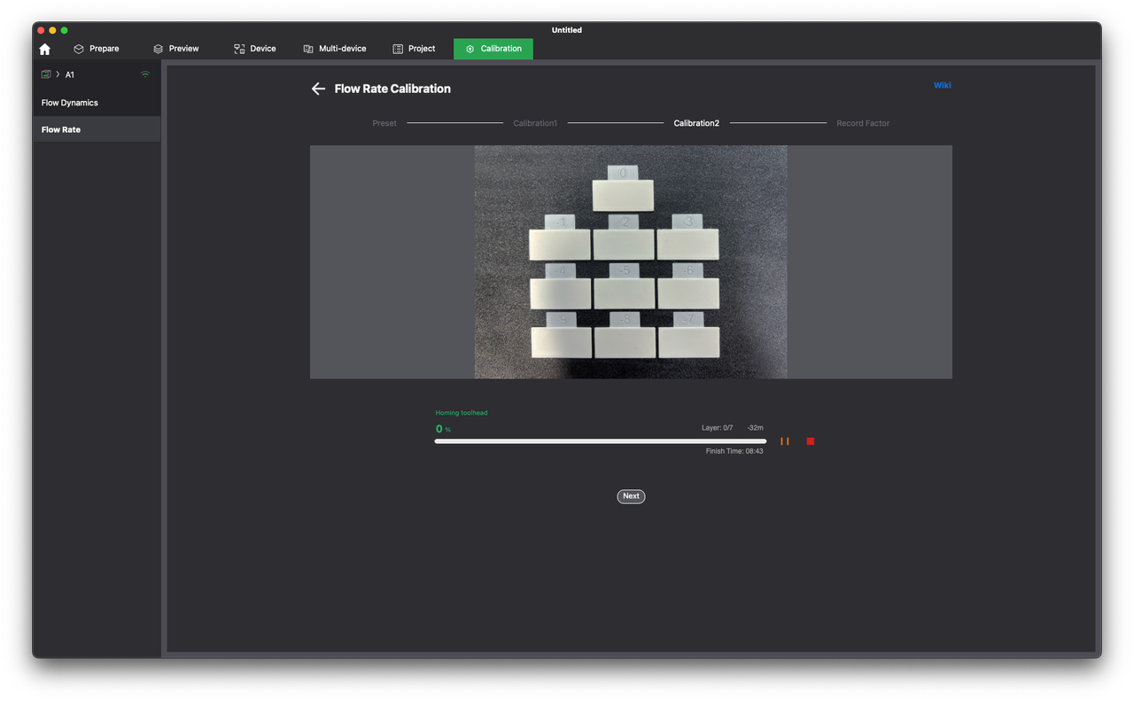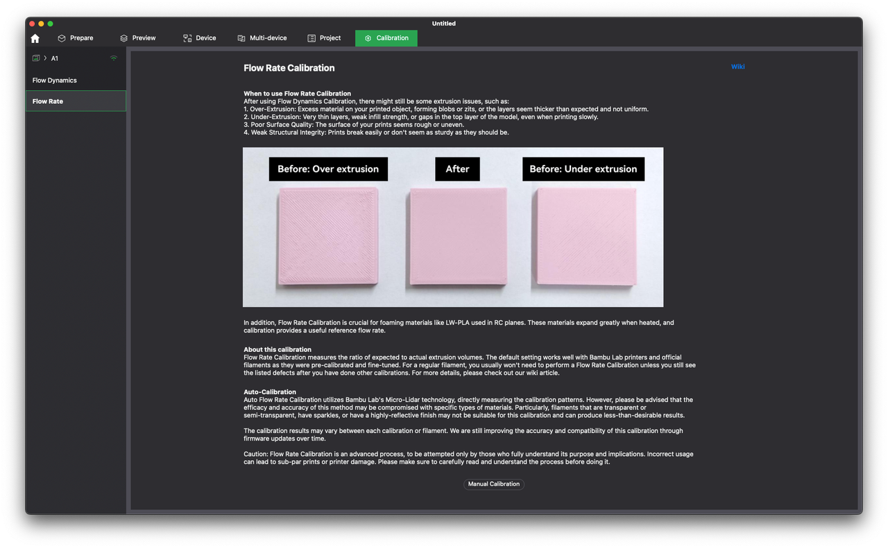 The Flow Rate calibration is done after the Flow Dynamics calibration has been performed and the plate has been cleaned and installed back on the printer. Simply navigate to the Flow Rate tab, then click on Manual Calibration.