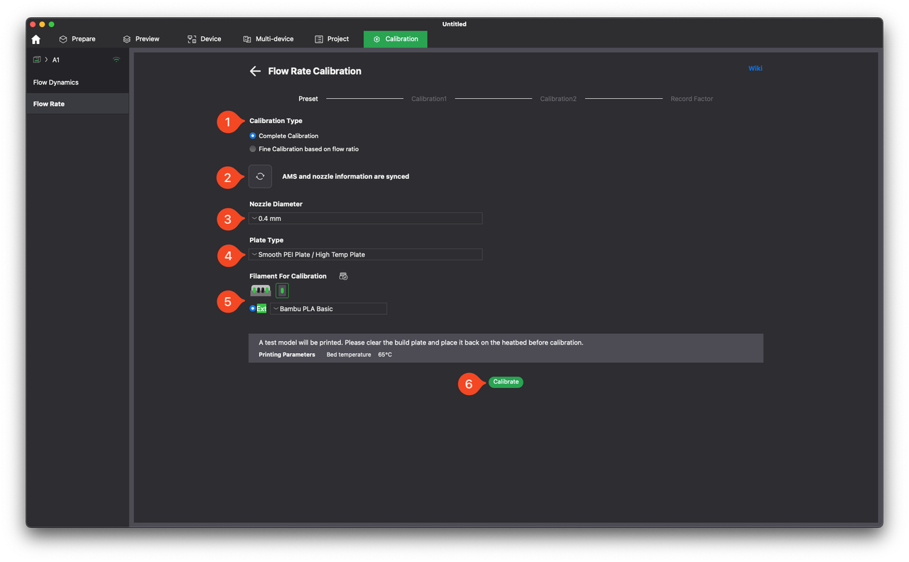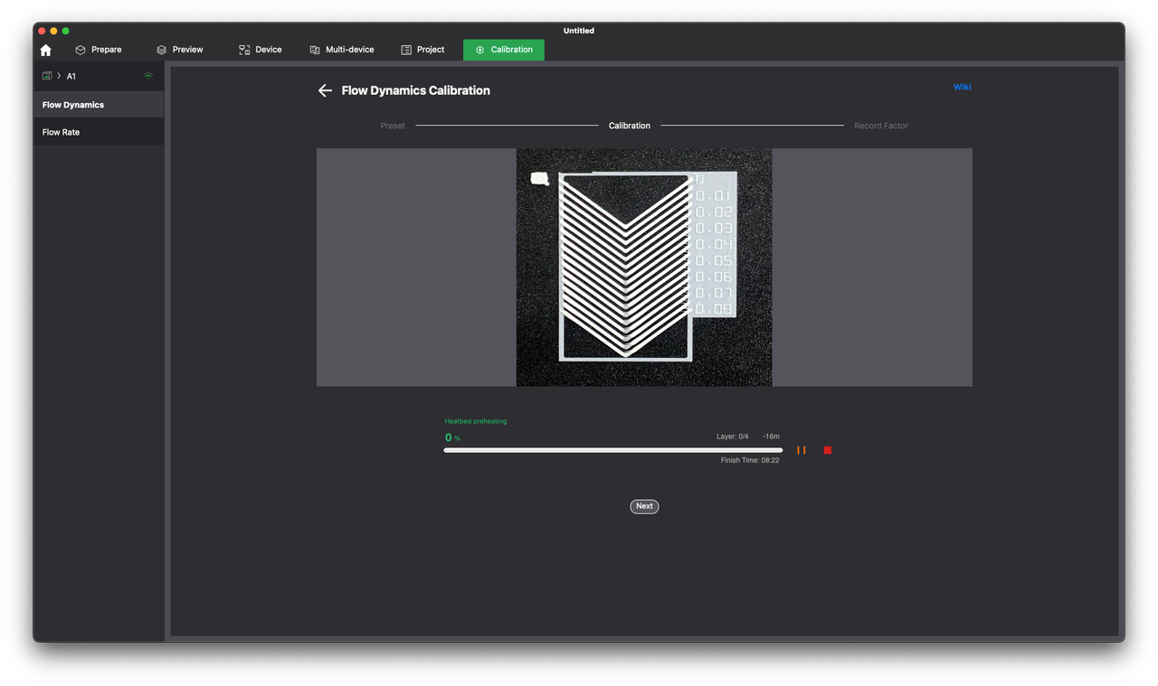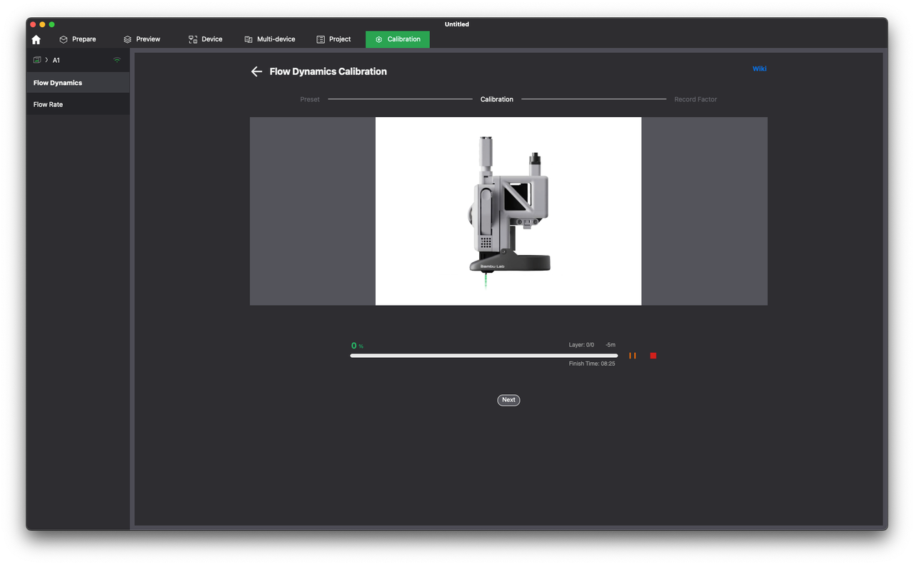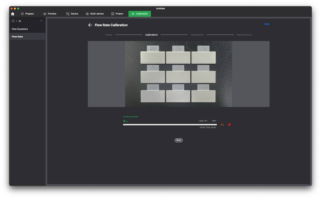 The Flow Rate calibration is done after the Flow Dynamics calibration has been performed and the plate has been cleaned and installed back on the printer. Simply navigate to the Flow Rate tab, then click on Manual Calibration.