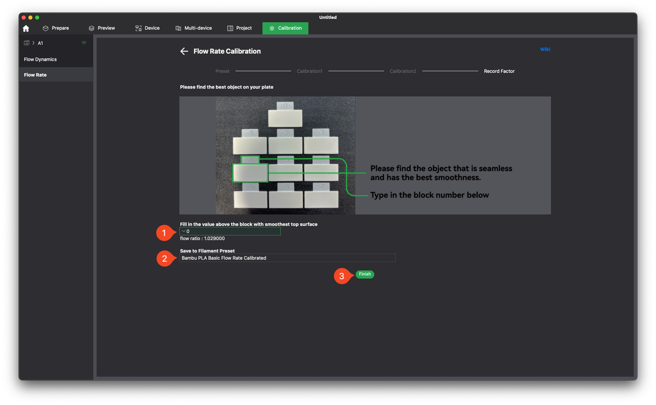 In Bambu Studio, select the sample which is the smoothest, in this case 0, then set the name for the filament preset. The calibration process is completed by clicking Finish.