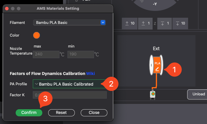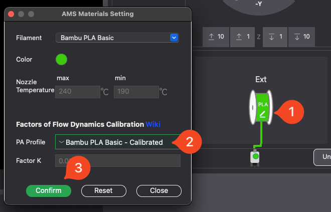 - Select the Filament For Calibration. It should be automatically detected based on the configuration done in the previous step. If you are using an AMS lite, make sure to select the external spool.