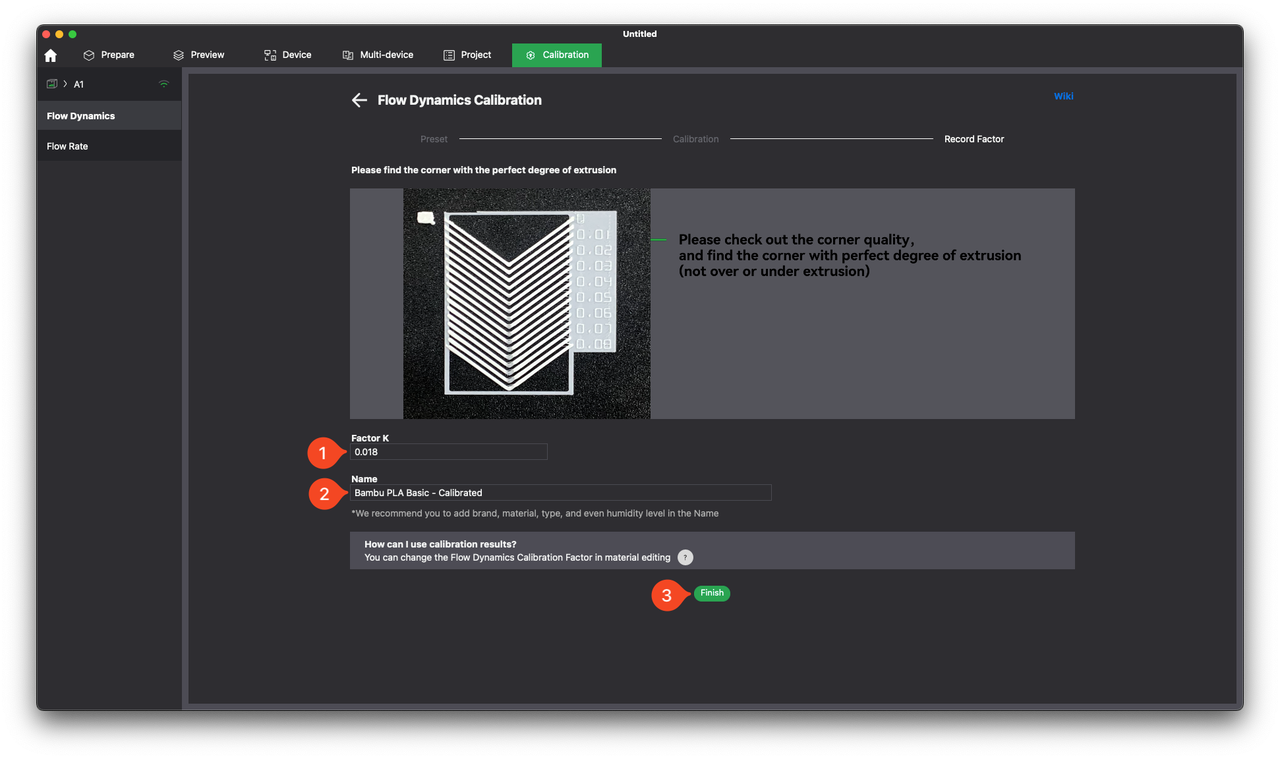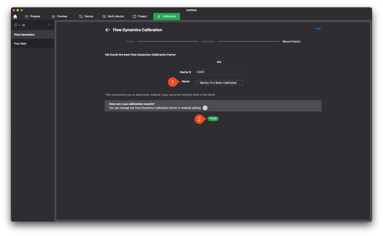Once you have determined the correct value, simply input it under the Factor K section, give a new name to the filament profile, then click on Finish to complete the calibration.