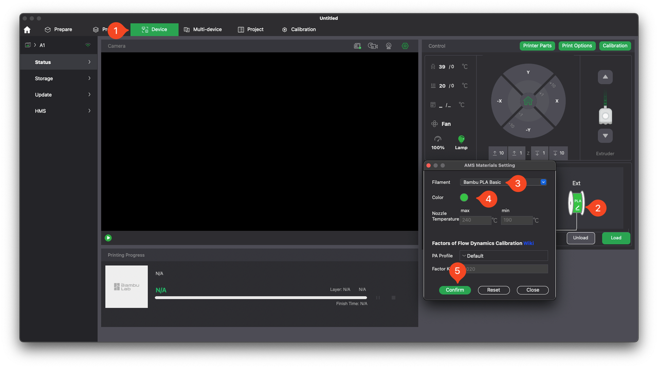 To calibrate Flow Dynamics, Open Bambu Studio, and ensure the filament is correctly configured in the settings. For this example, we will use Green Bambu Lab PLA Basic printed from the spool holder. Go into the Device tab, select the type and color of the filament, then confirm it.