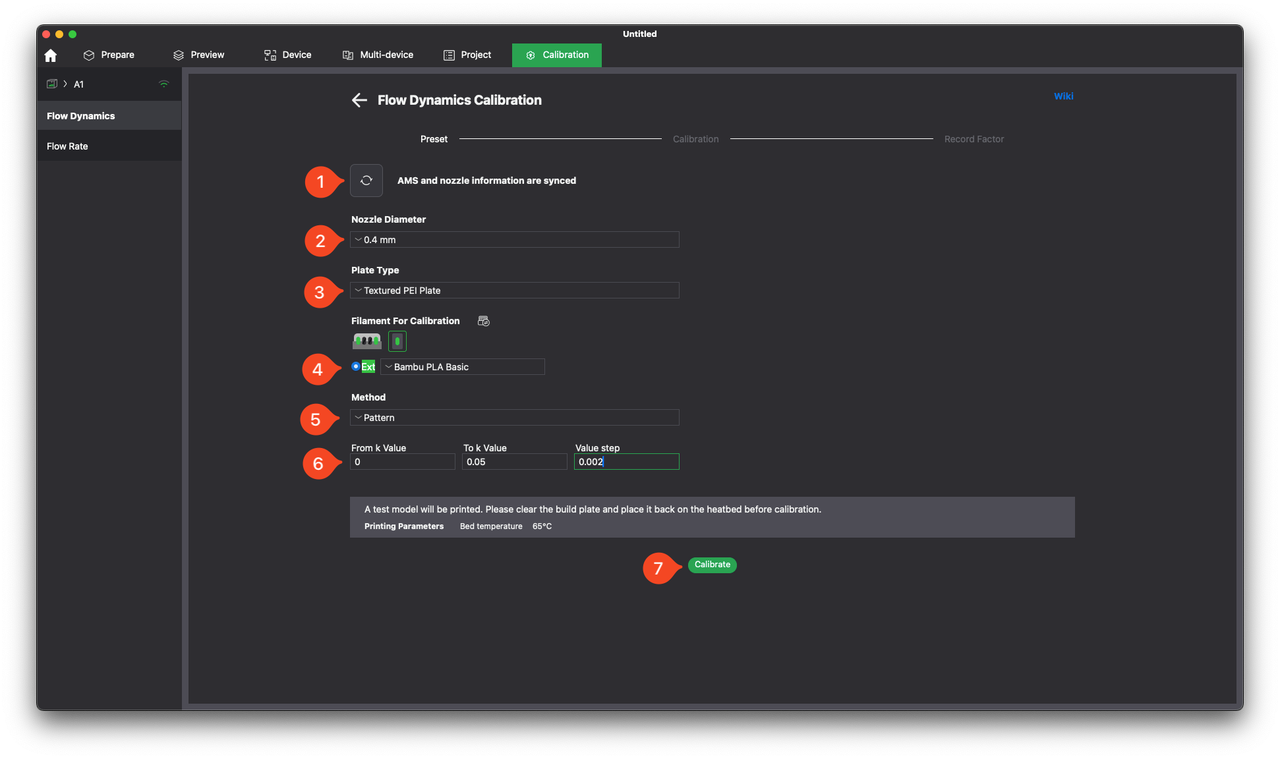 Some filaments might produce slightly inaccurate results when using the Auto-Calibration feature. For such filaments, you can perform Manual calibration, where you can fine-tune the calibration results visually.