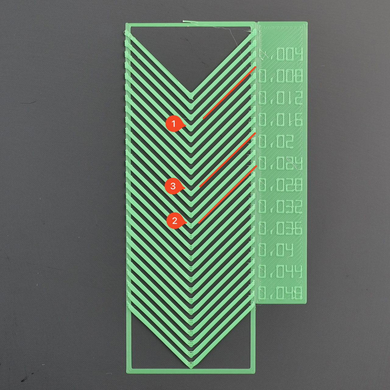Now that the pattern is successfully printed, you will need to visually determine which of the printed values has the cleanest printed corner. The corner should be as sharp as possible, without any signs of under-extrusion.