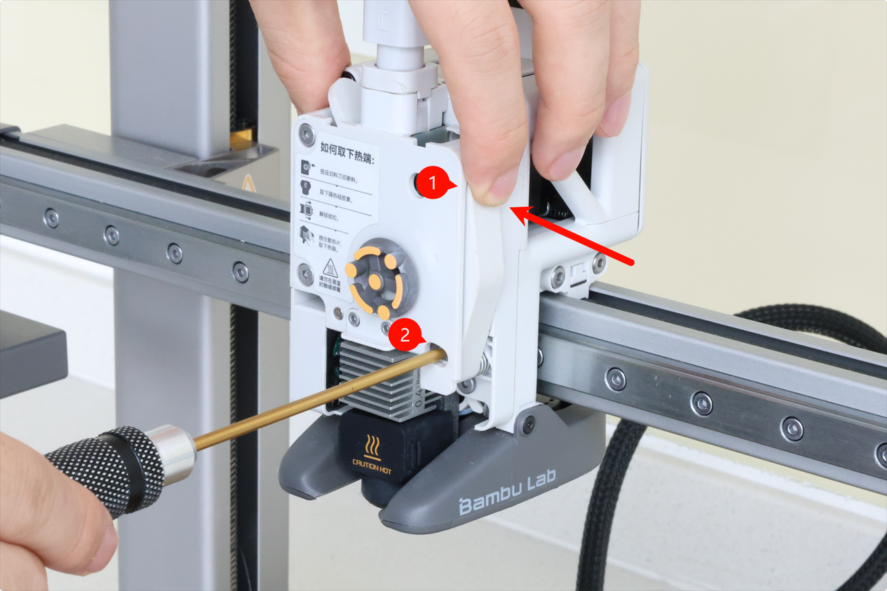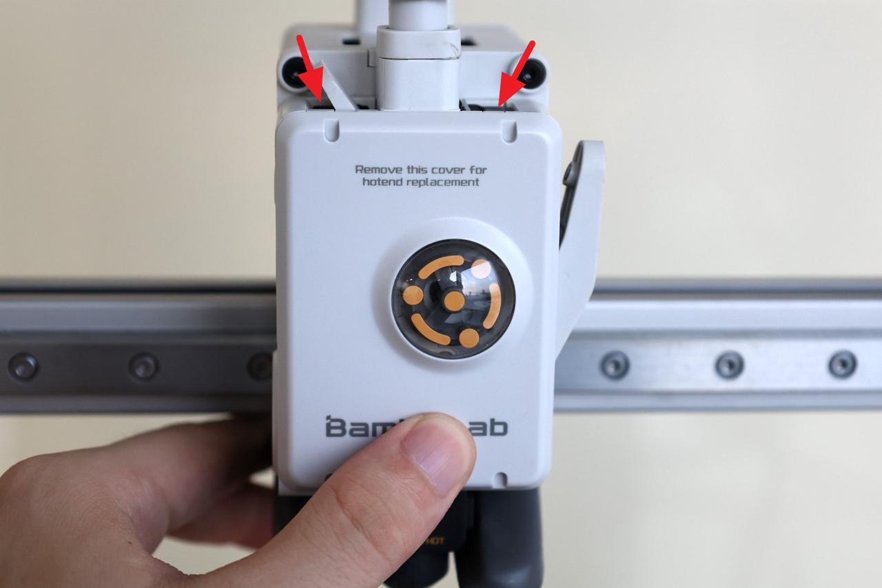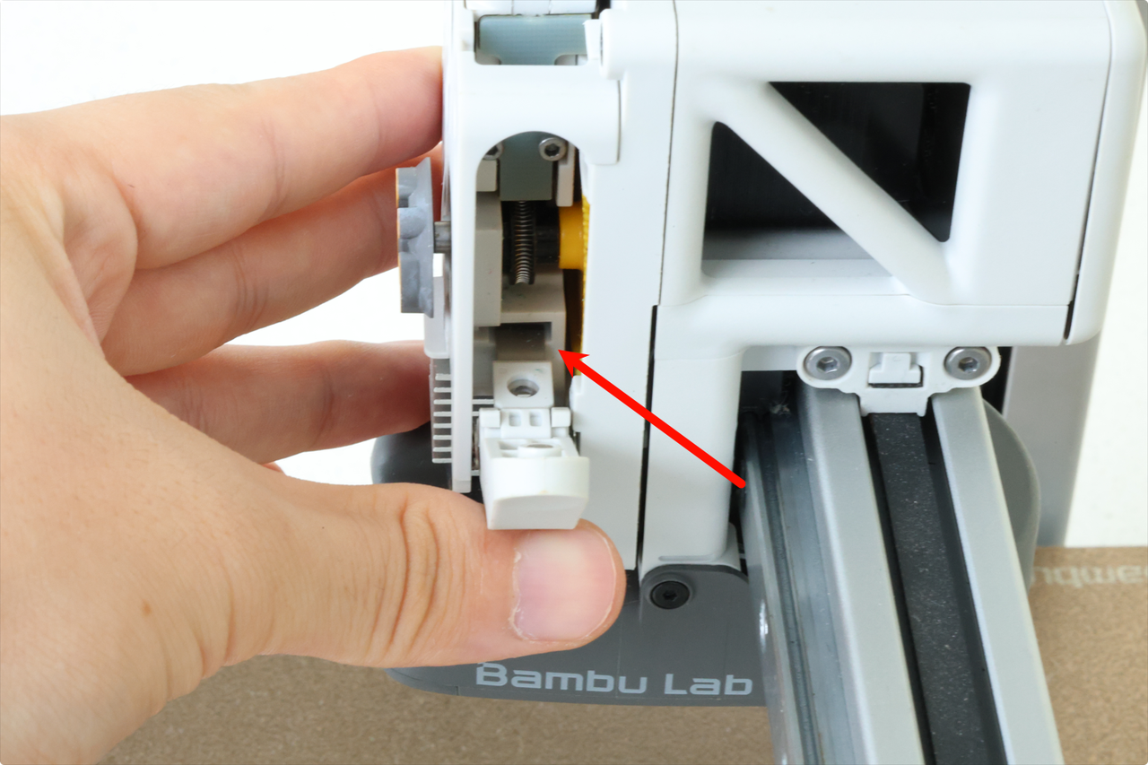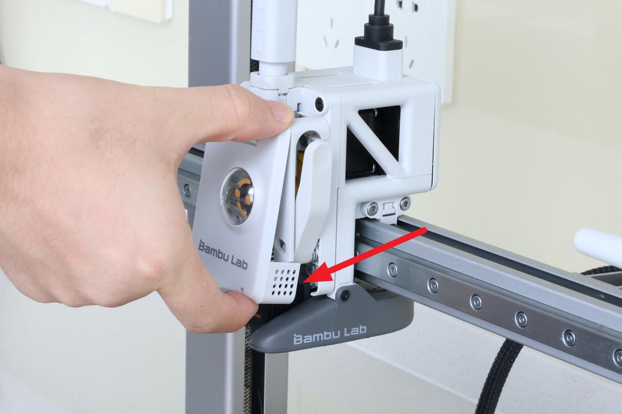 The first step in replacing the filament cutter blade on the A1 is to remove the toolhead front cover. Grab the base of the front cover and gently pull towards you.