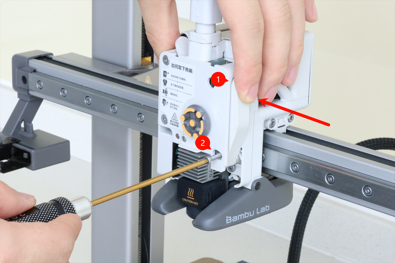 The next step is to release the filament cutter lever. To do it, start by holding the filament cutter pressed to allow for easy removal of the single screw holding it in place.