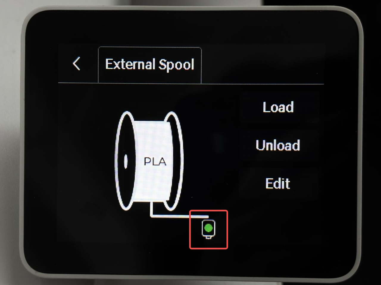 Keep pushing the filament upwards until it stops and the filament sensor icon on the screen changes from white to green, indicating it has reached the extruder.