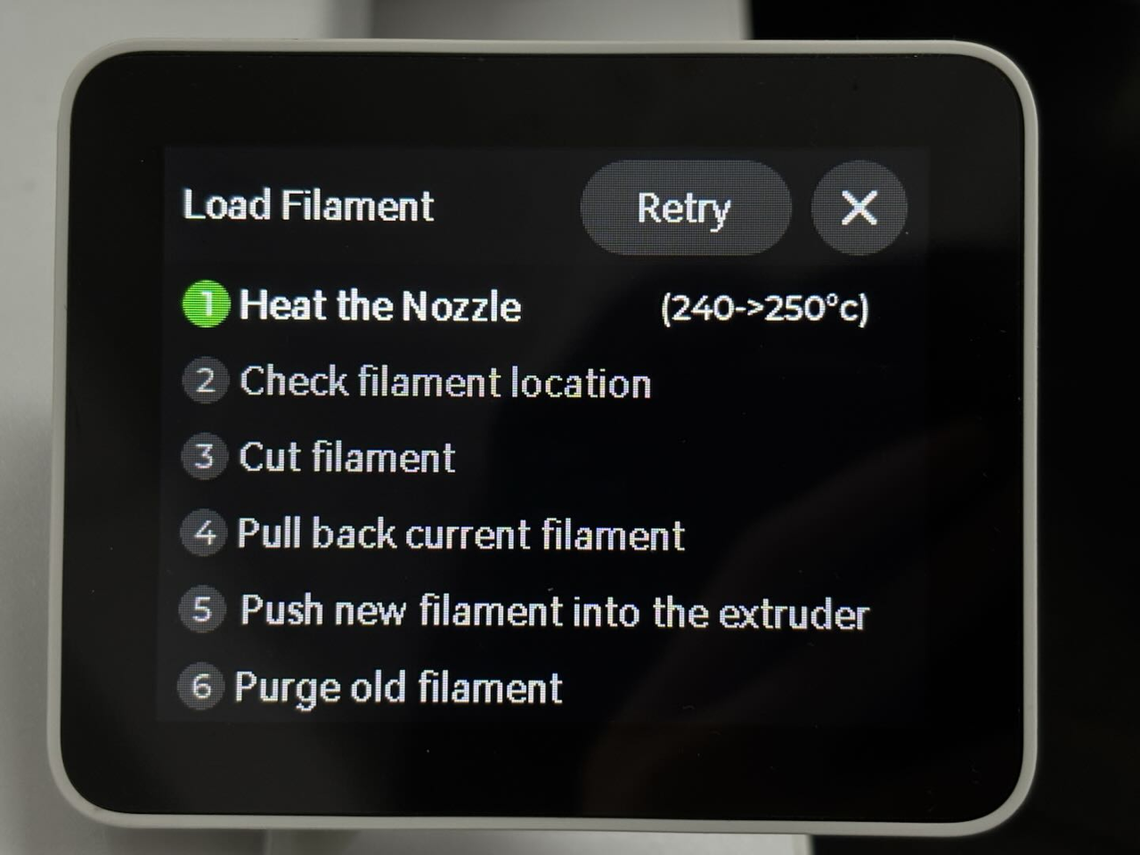 The printer will start performing all the steps displayed on the screen to heat the nozzle and push the filament into the nozzle to prepare for printing.