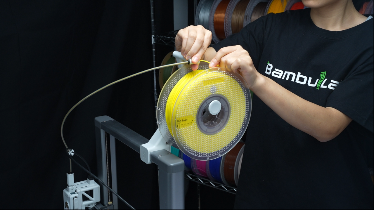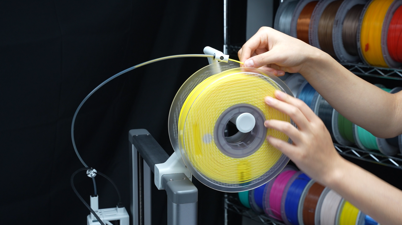 Install the spool on the spool holder and gently feed the filament through the PTFE tube on the side of the printer. Ensure that the filament feeds smoothly without kinks or snags for a reliable loading process.
