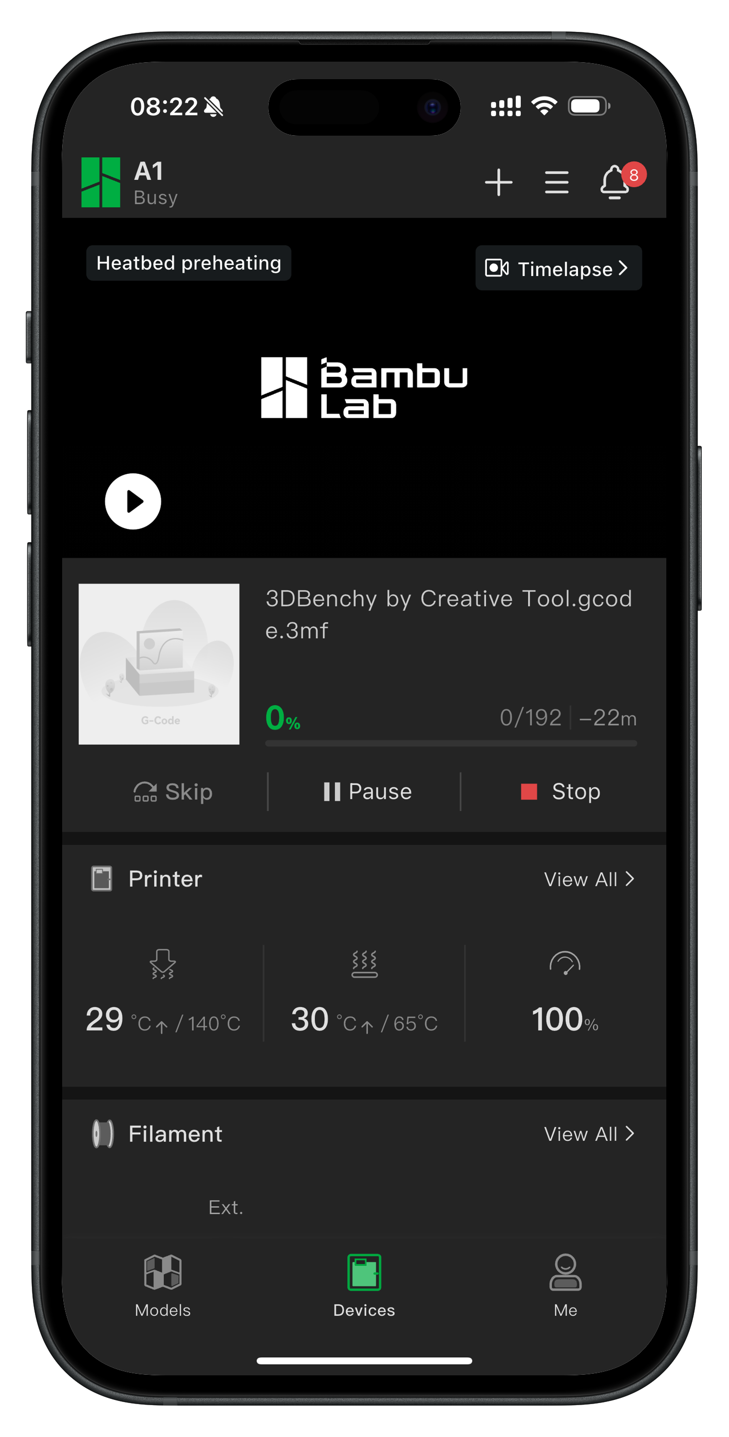 Bambu Handy is a mobile application compatible with iOS and Android that provides remote control over the printer’s features. You can control each axis of the printer, check on your printer’s camera to confirm everything is working as expected, and adjust basic settings like print speed or temperature.