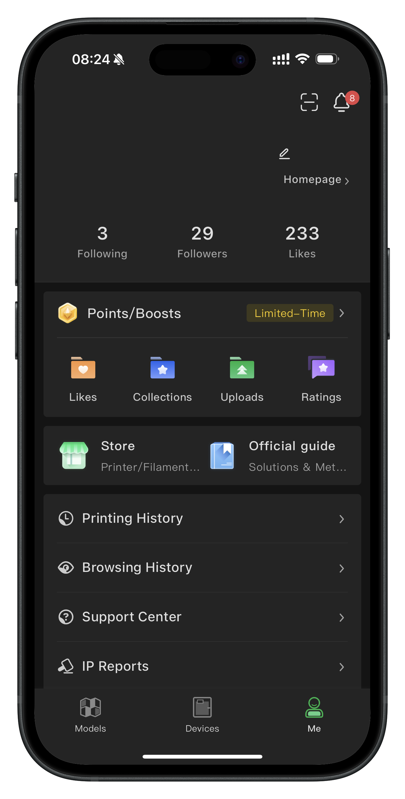 Besides the 3D printing features, you also have access to your Bambu Lab Account details to open Customer Support tickets if you need assistance, and to access the Bambu Lab Wiki if you wish to learn more about 3D printing.