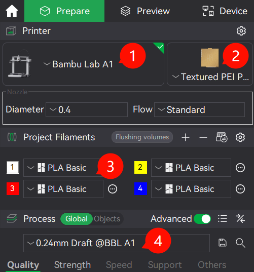 1. Select the printer you wish to print the model on, and the right nozzle size (0.4mm comes as default).