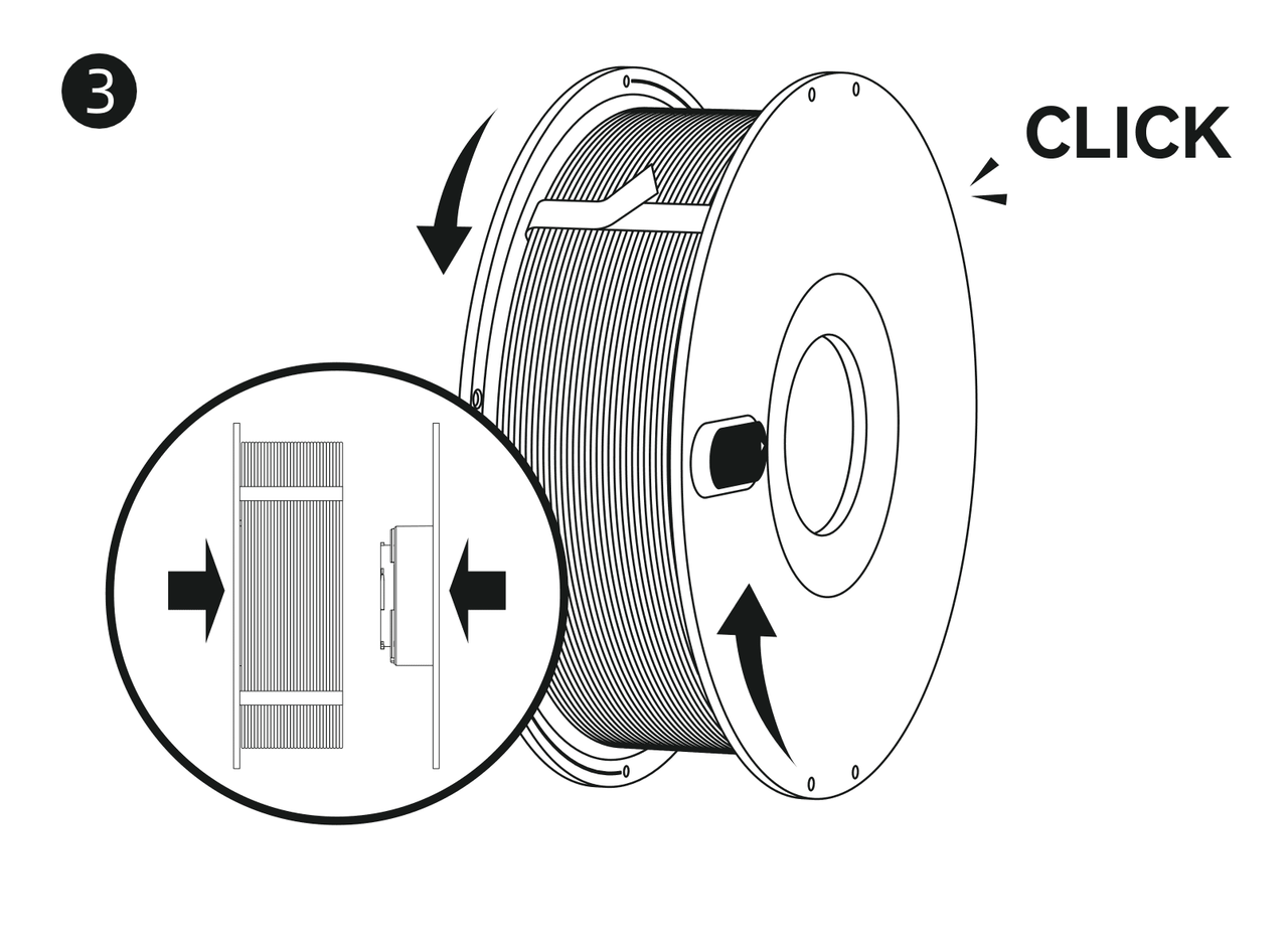 Once aligned, put the two sides of the spool together and spin the sides until you hear a click.
