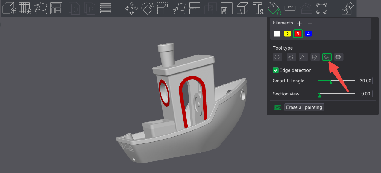 With just one click, the Fill tool allows you to color entire sections of your model. It automatically detects sharp edges, ensuring clean color separation. If needed, you can fine-tune this detection using the Smart Fill Angle slider, which controls how much geometry is colored based on the angles between the faces of the model.