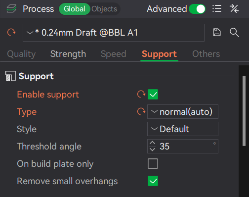 In some situations, it is not possible to orient the model in such a way that removes or minimizes the support usage. When that’s the case, it is recommended to enable support generation in Bambu Studio.