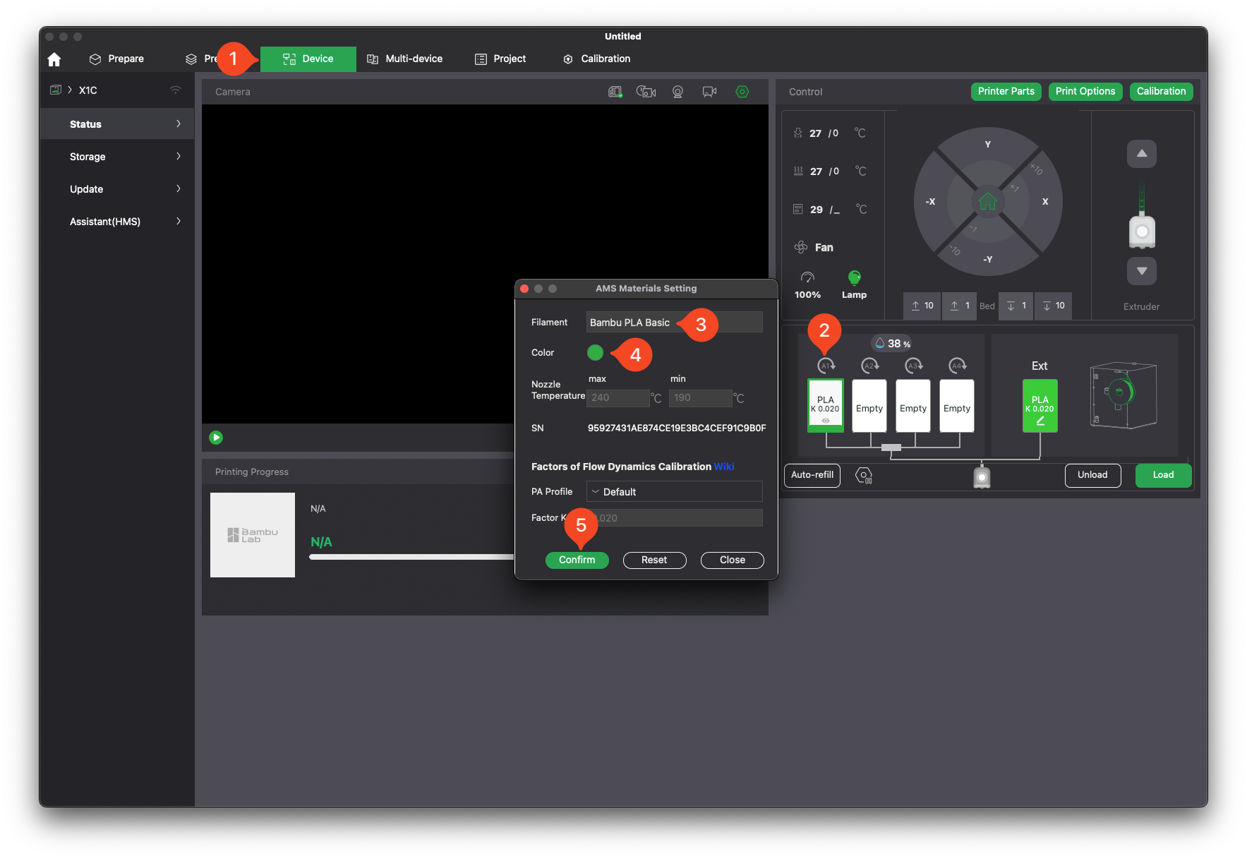 To calibrate Flow Dynamics, Open Bambu Studio, and ensure the filament is correctly configured in the settings. For this example, we will use Green Bambu Lab PLA Basic printed from the spool holder. Go into the Device tab, select the type and color of the filament, then confirm it.