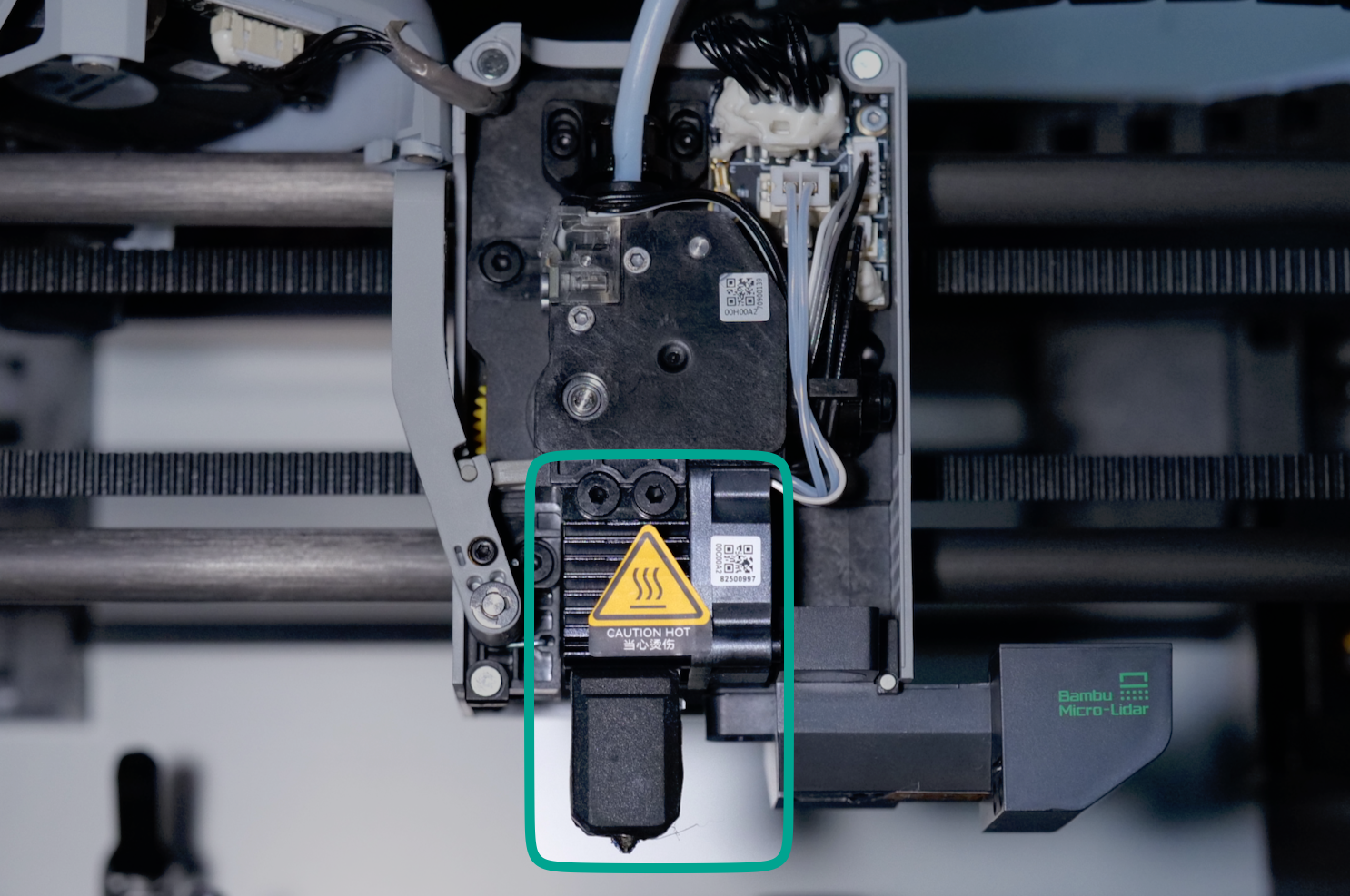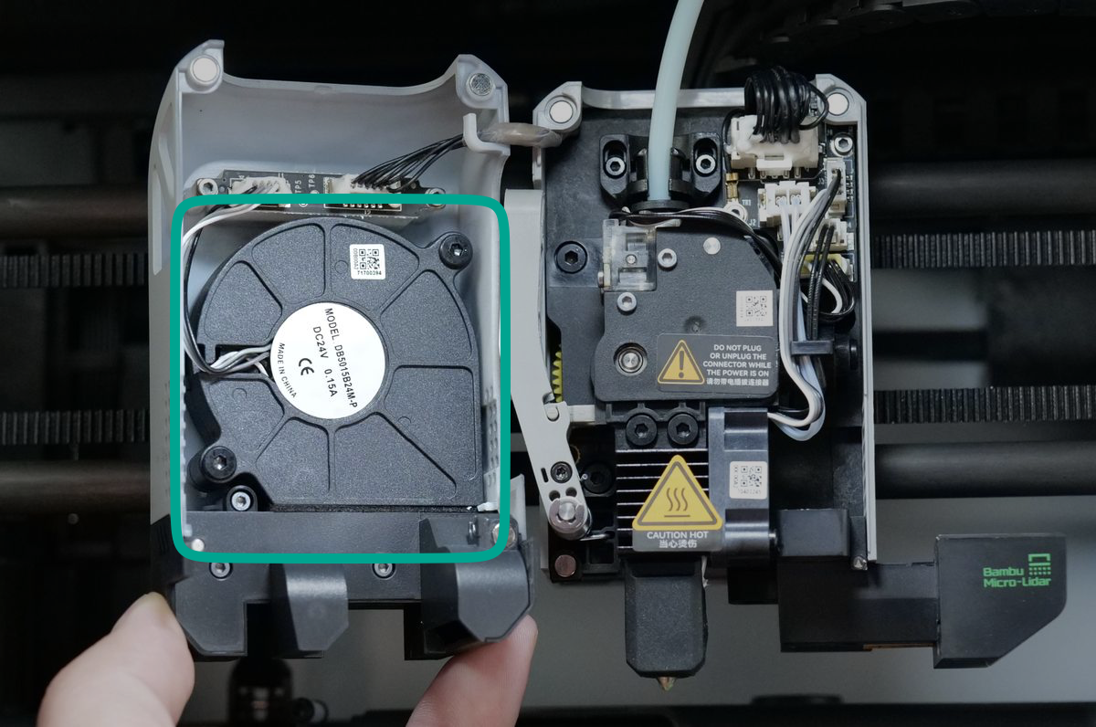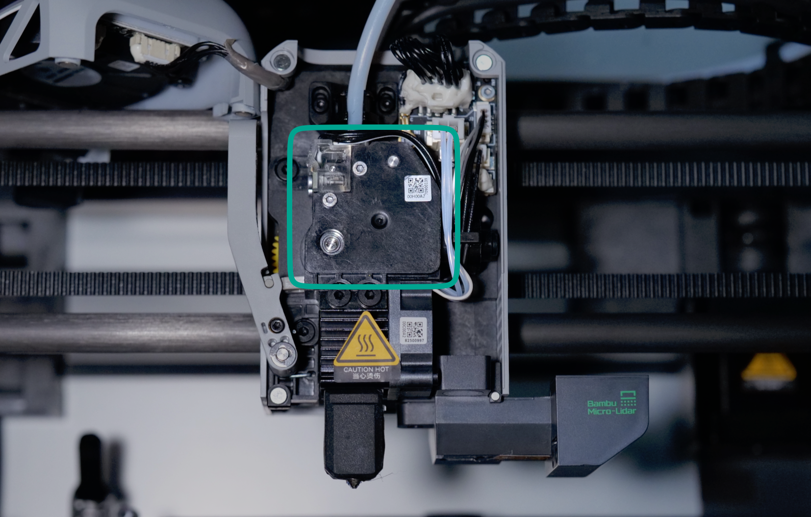 The toolhead of the X1C is a compact assembly that houses several essential electronics and sensors. The most important components are:
