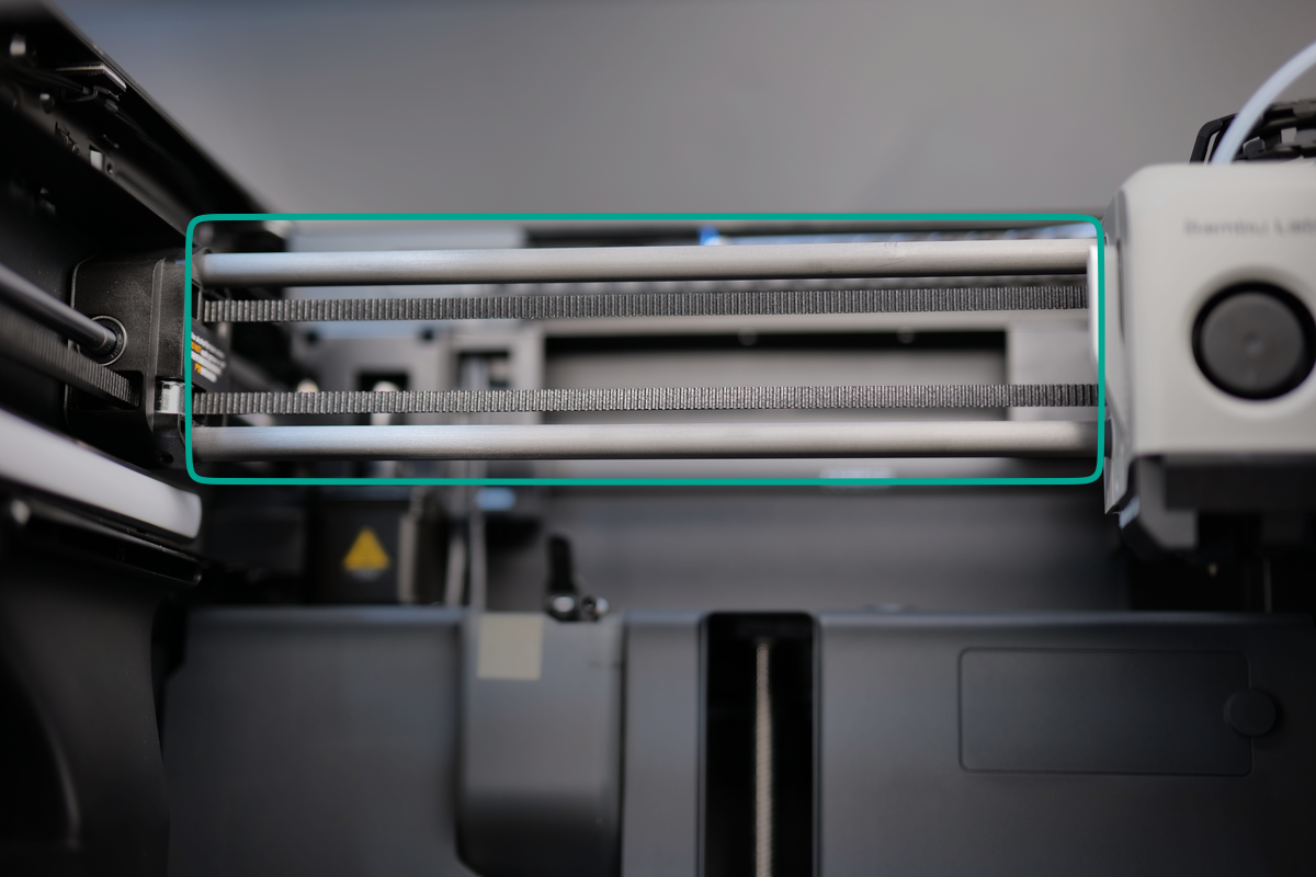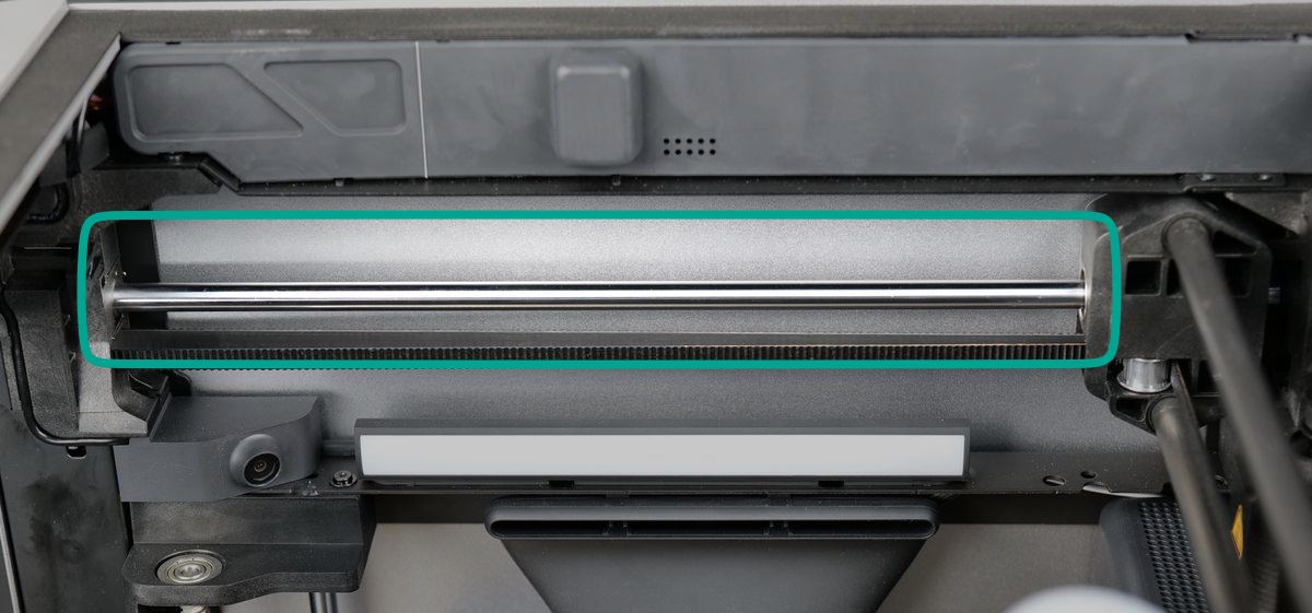 The X1C features a pair of Y-axis linear rods, made of metal, positioned on the top left and right sides of the printer. These rods serve as the foundation for the X-axis movement, allowing the X-axis to travel smoothly in the Y-axis direction.