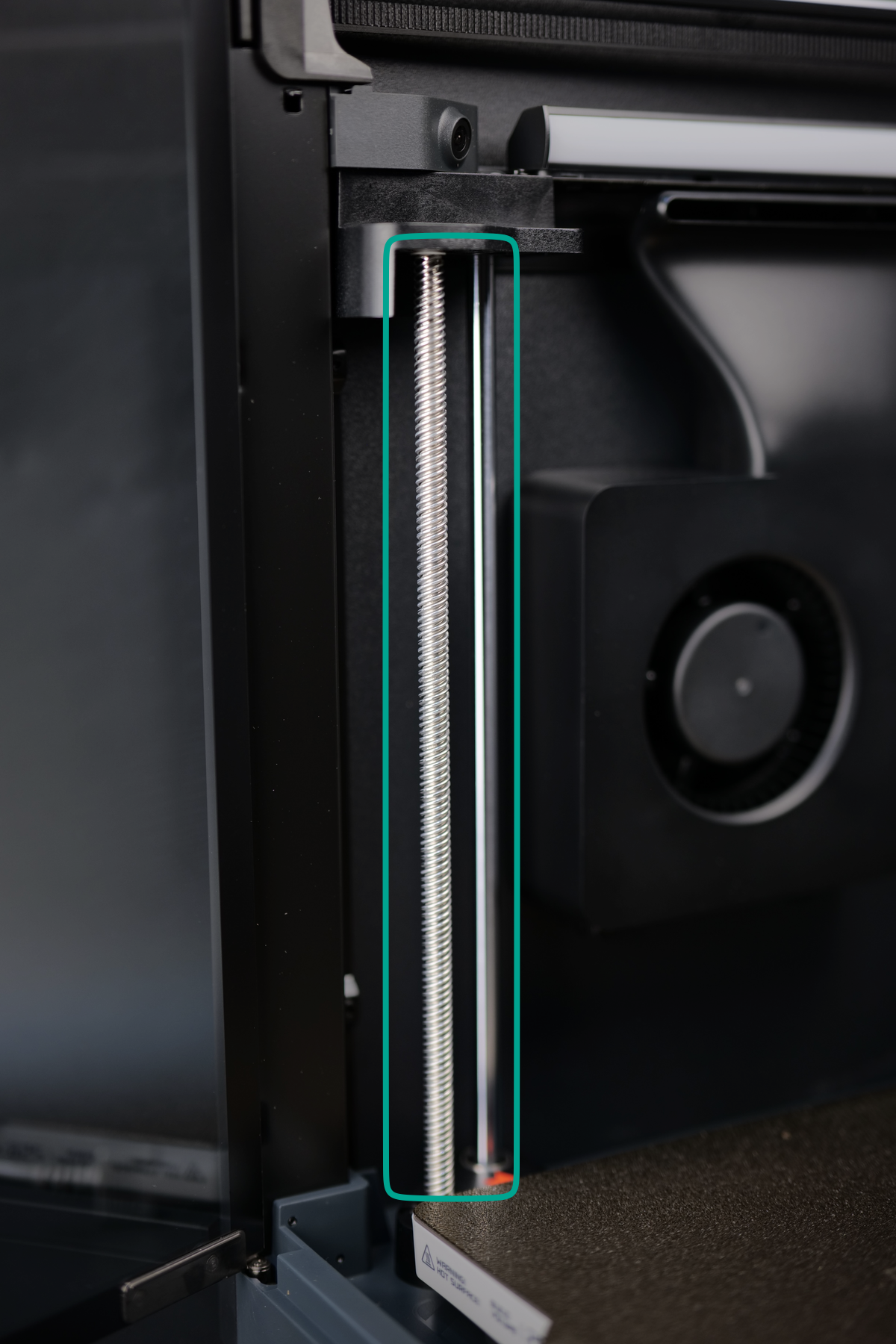 To maintain stability and precision, the heatbed moves along linear rods (shown on the right) placed next to each leadscrew. This combination of synchronized leadscrews and guiding rods ensures smooth, accurate motion, allowing for reliable layer height control and high-quality prints.