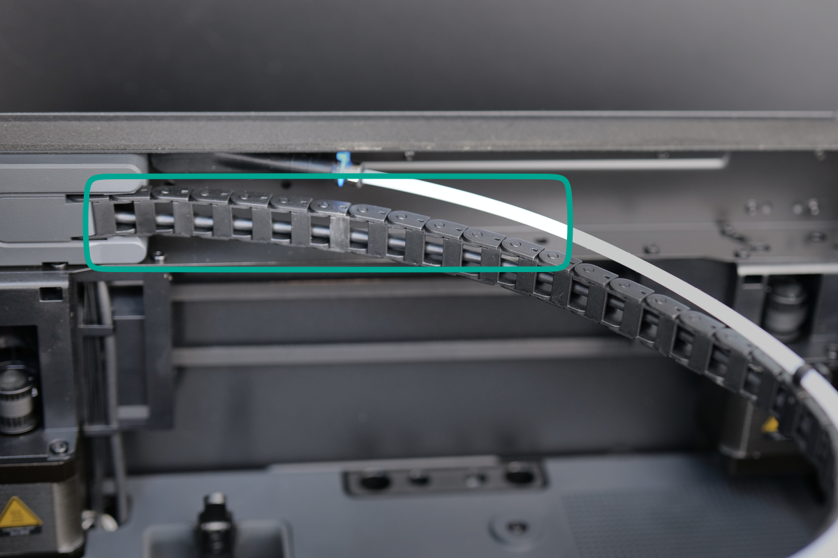 The cable chain is made from plastic and is designed to support and organize the cablerunning to the toolhead. This ensures the cable remain secure and is protected from damage during the printer’s movement. Attached to the cable chain is the white PTFE tube, which helps guide the filament from the spool to the extruder, ensuring smooth and efficient filament feeding without tangling or obstruction.
