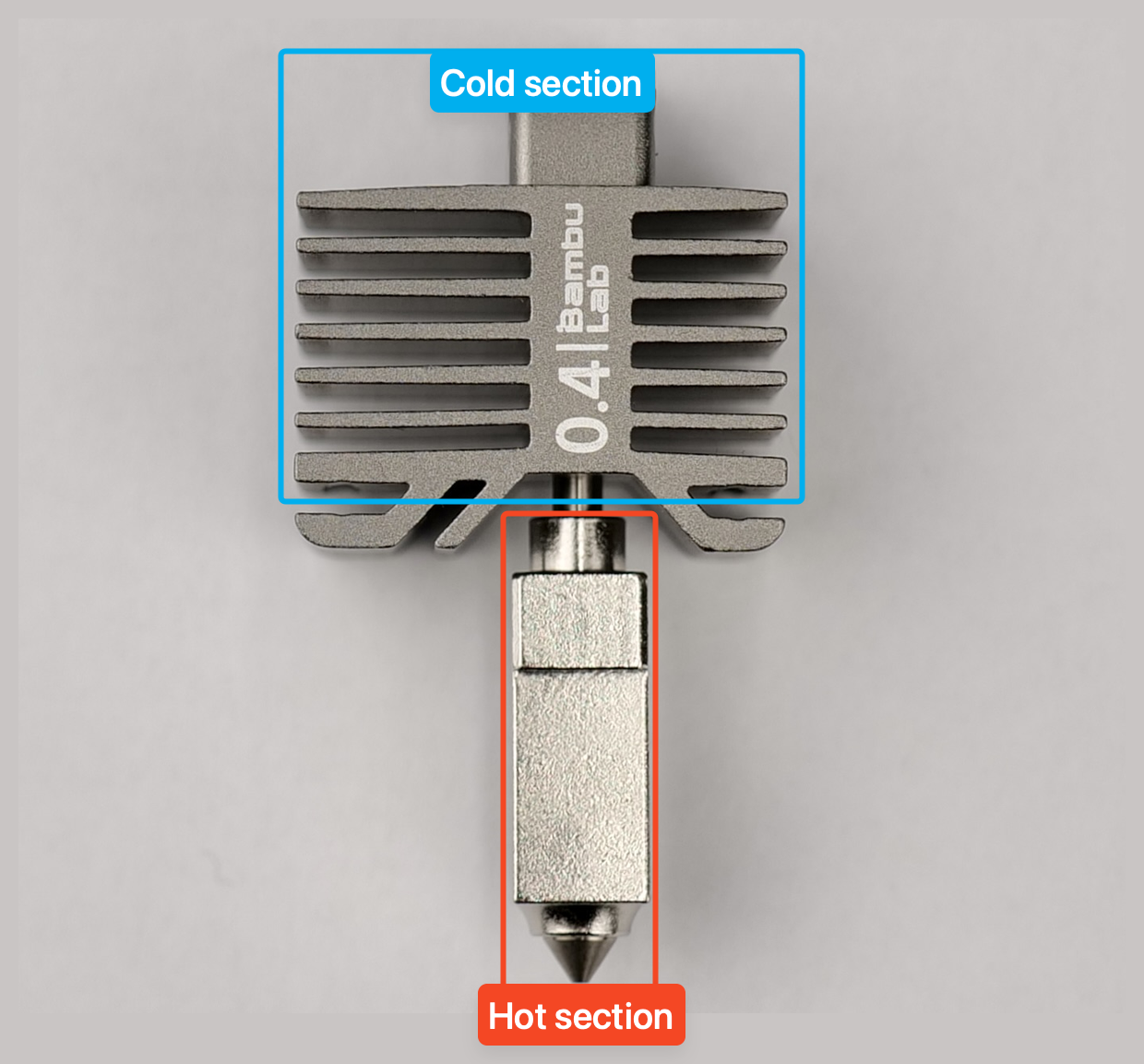 - The cold end section containing a heatsink to keep the filament cool until it goes inside the hot end, and it’s kept cool by the small hot end fan on its left.