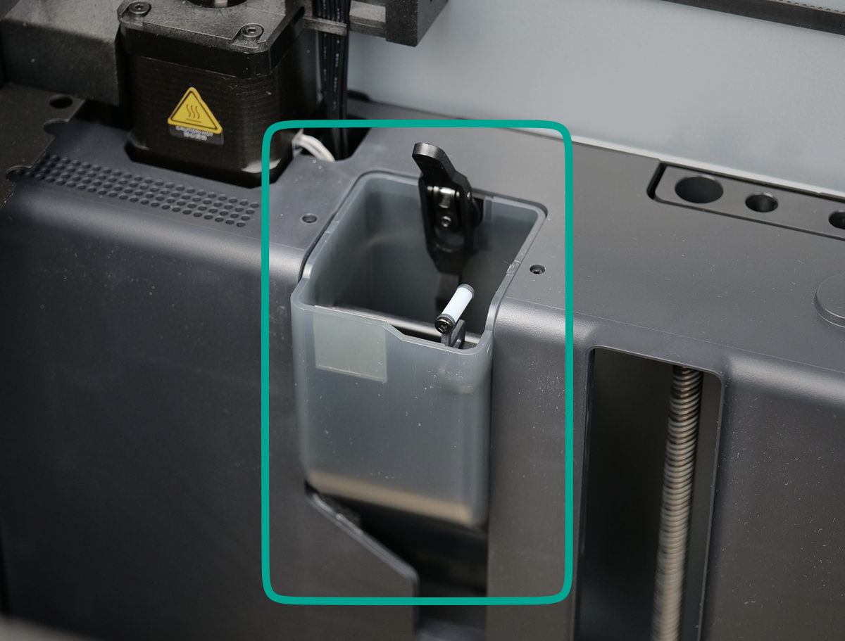 Additionally, the nozzle wiper, located on the front right side of the chute, wipes excess filament from the nozzle tip before a print begins or during a filament change. This keeps the nozzle clean, reducing defects caused by filament buildup.