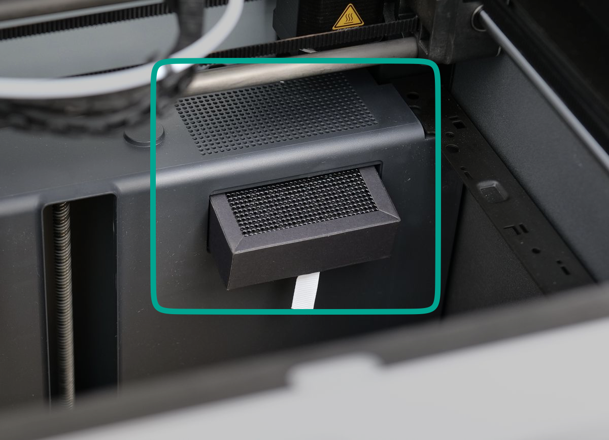 The carbon filter, located at the back right side of the printer’s chamber and it is used for air filtration. It helps reduce odors and airborne particles by filtering the air before it is expelled through the chamber exhaust fan.