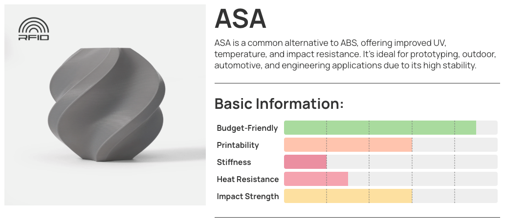 However, like ABS, ASA is prone to warping and benefits from being printed in an enclosed, temperature-controlled environment. It also emits noticeable fumes during printing, so proper ventilation or an air filtration system is recommended.