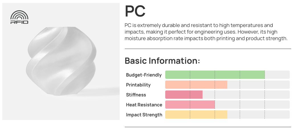 Like ABS and ASA, PC emits noticeable fumes when printing, so proper ventilation is recommended. PC is also highly hygroscopic, meaning it readily absorbs moisture from the air, which can lead to poor print quality, bubbling, and weakened prints. To maintain optimal performance, PC filament should be stored in an airtight container with desiccants and dried before use if necessary.