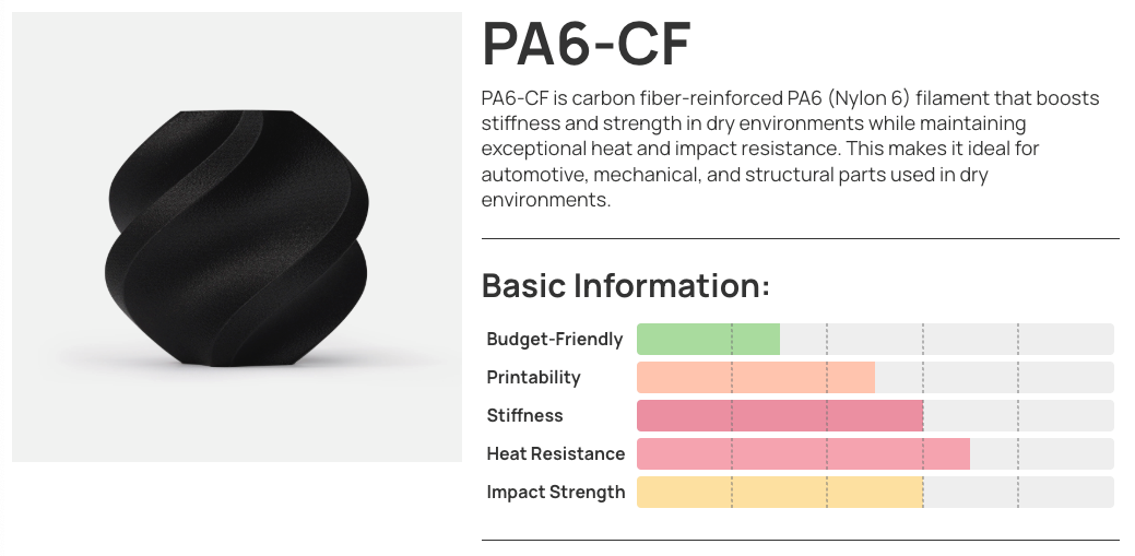 Compared to standard versions of their base materials, carbon fiber-infused filaments offer greater stiffness, reduced warping, and lower thermal expansion, leading to better dimensional stability and improved print accuracy. However, they also tend to be more brittle, meaning parts may snap rather than bend under extreme stress.