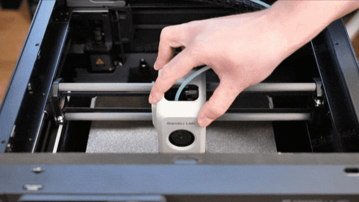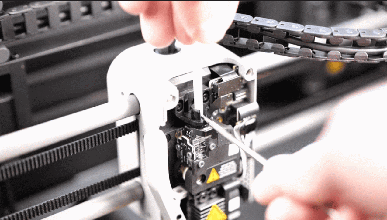 To release the PTFE tube, simply use a hex wrench to press down on the tube coupler, as shown below. While the coupler is pressed down, the tube can be easily pulled out. When doing this operation, be careful not to damage the black ribbon cable of the filament sensor.