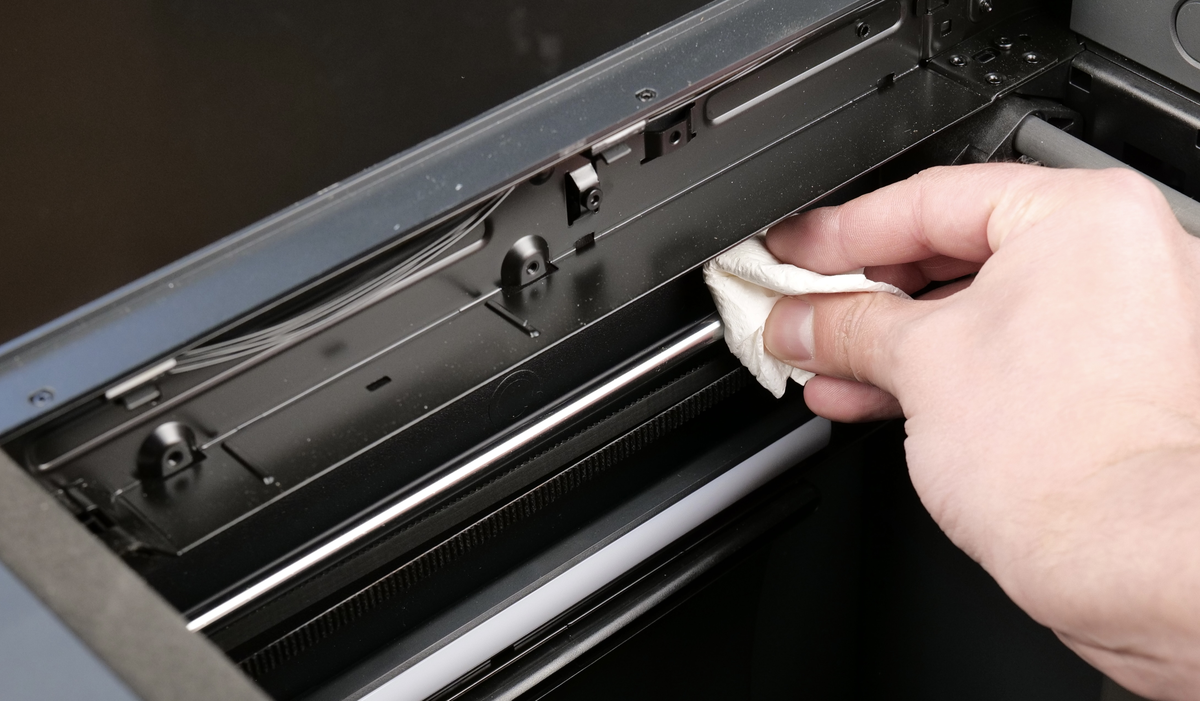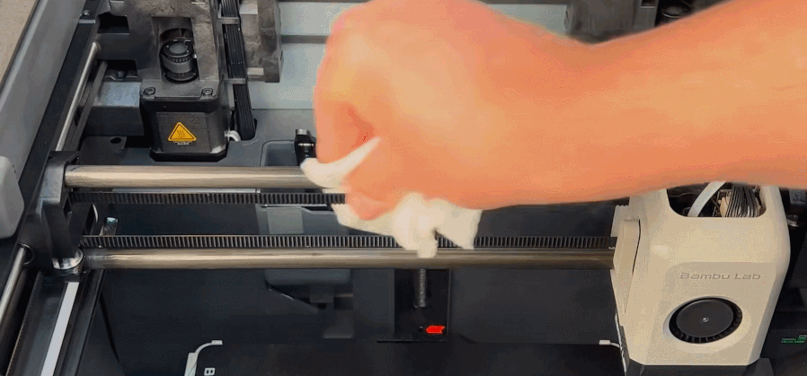 It is also recommended to move the print head along the X axis a few times, with the carbon rods soaked with IPA, to help clean the inside of the bushings too.