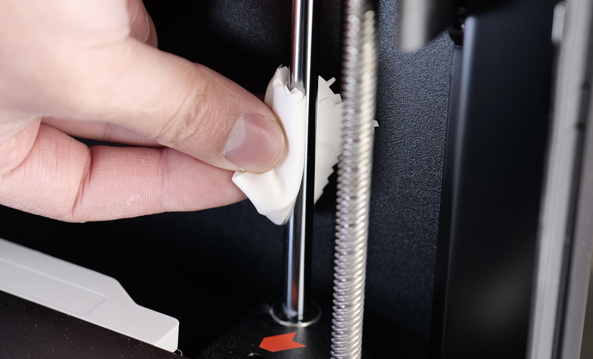 Let’s start with the linear rods. Just like the Y-axis, the rods need to be cleaned first by using a clean paper towel or microfiber cloth. Start by lowering the heatbed to the lowest position, then gently wipe them to remove any dust or contaminants.