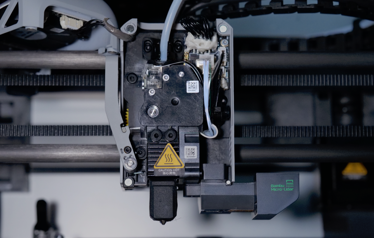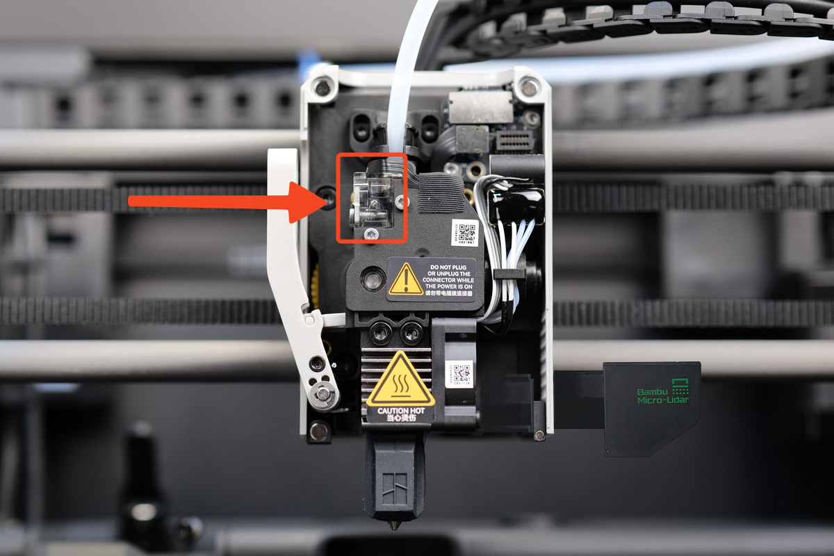 This sensor detects the presence or absence of filament and pauses the printer if the filament runs out, breaks, or jams, preventing the printer from continuing without material and ruining the print. Once new filament is loaded, the printer can resume from where it left off, saving time and material. For the X1C, the filament sensor is located on the extruder and is connected to the toolhead with the black ribbon cable.