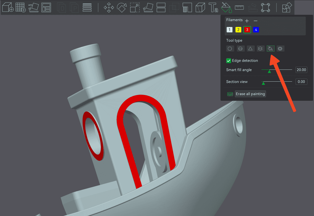 With just one click, the Fill tool allows you to color entire sections of your model. It automatically detects sharp edges, ensuring clean color separation. If needed, you can fine-tune this detection using the Smart fill angle slider, adjusting how the tool recognizes edges for more precise control.